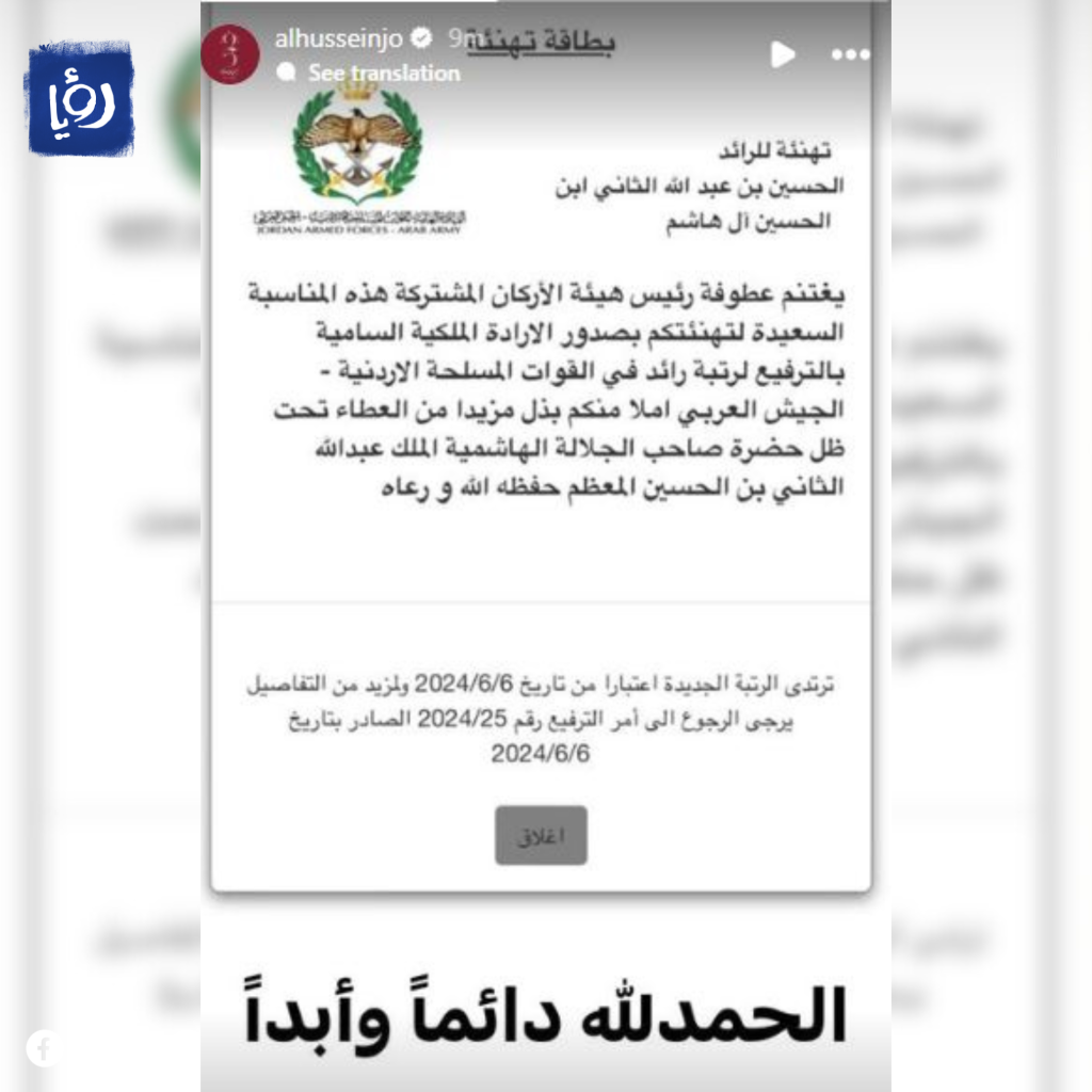 ونشر سموه بطاقة تهنئة بمناسبة ترفيعه إلى رتبة رائد في القوات المسلحة الأردنية - الجيش العربي، عبر خاصية "ستوري" على حسابه على موقع "إنستغرام"، وعلق عليها بكتابة "الحمدلله دائما وأبدا".