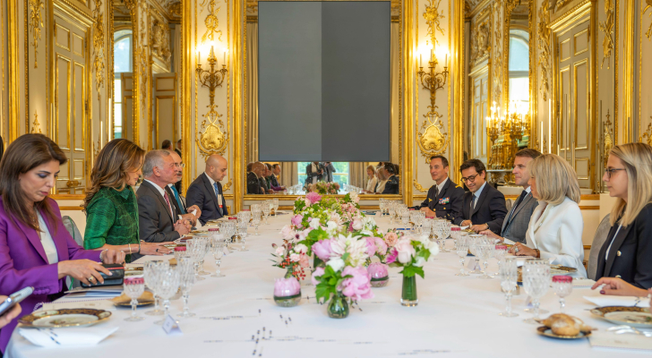 ولدى وصول جلالة الملك، ترافقه جلالة الملكة رانيا العبدالله إلى قصر الإليزيه، كان الرئيس الفرنسي والسيدة عقيلته في مقدمة المستقبلين.
