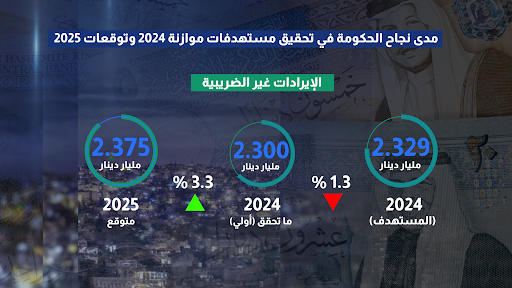 أما إيرادات الحكومة من غير الضرائب، فقد سجلت تراجعا وفق الارقام الاولية لتصل إلى 2.3 مليار دينار وبنسبة 1.3% عن المستهدف فيما توقعت ان تعود إلى المستويات التي كانت متوقعة في العام الحالي وبنمو 3.3% مع الارقام المعاد تقديرها.