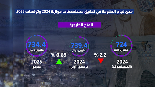 أما المنح الخارجية، هو البند الوحيد الذي حقق أكثر من المستهدف بنسبة نمو 2.2% إذ حصل الأردن على منح بحجم 739.4 مليون دينار بعد إعادة تقدير لأرقام العام الحالي فيما توقع تراجع طفيف في العام المقبل تأكيدا على تأسيس مبدأ الاعتماد على الذات.