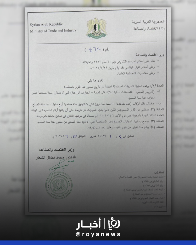 أصدرت وزارة الاقتصاد والتجارة الخارجية في سوريا قرارًا يقضي بإيقاف استيراد السيارات المستعملة اعتبارًا من تاريخ صدوره، مع تحديد استثناءات لحالات معينة نص عليها القرار.